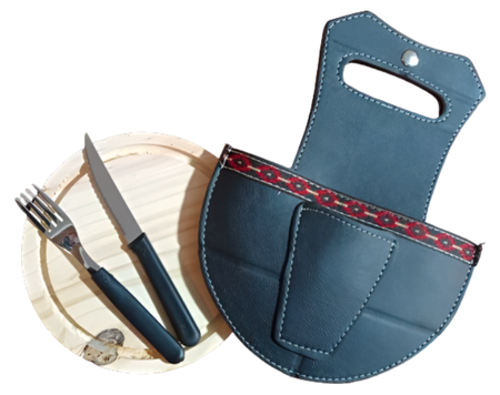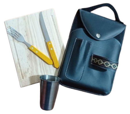 Plato Tabla Asado Rectangular + cubiertos + Vaso Pampa y Funda de cuero